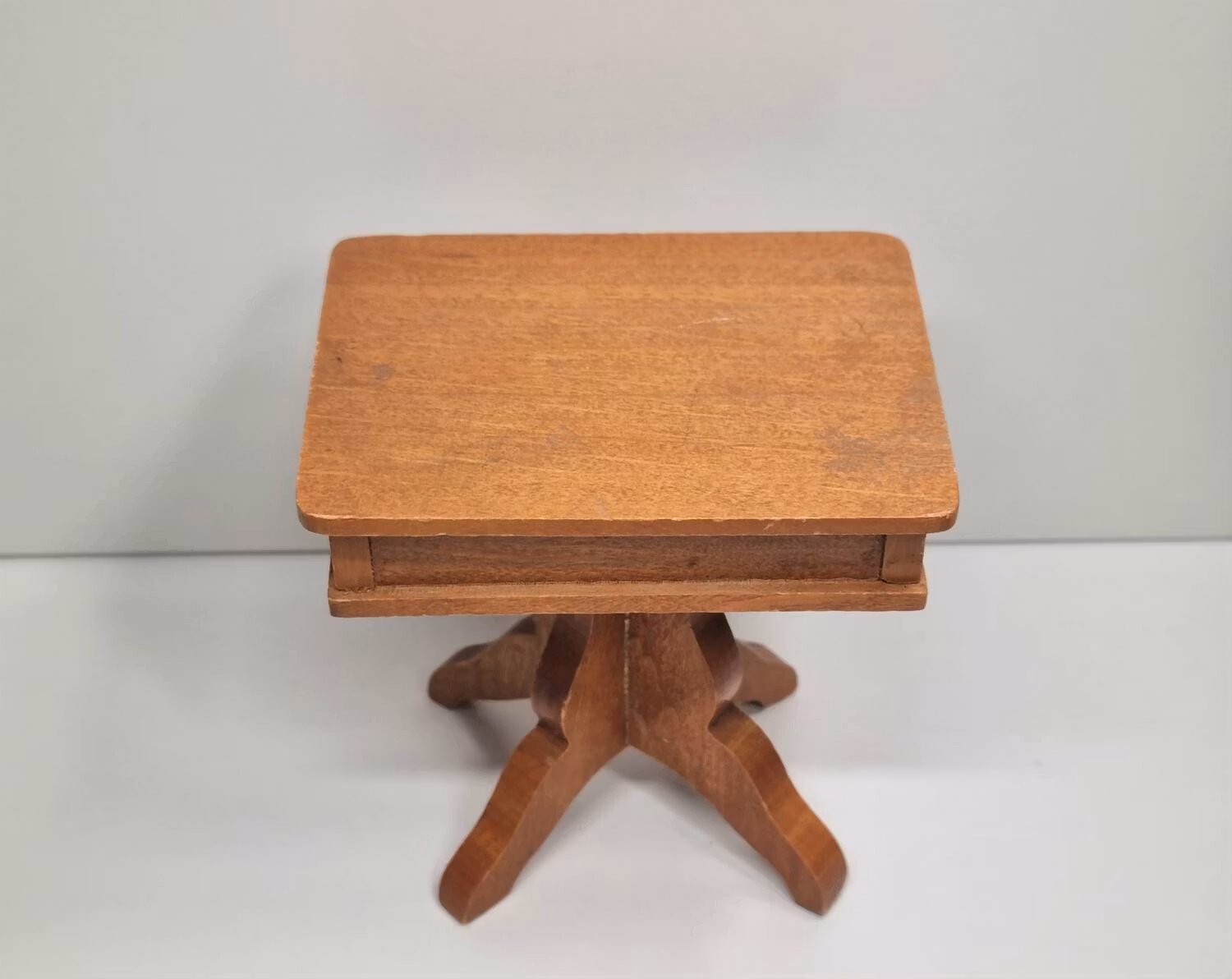 Dockskåpsmöbel till dockskåp / tittskåp i form ett nattduksbord med en låda som går att dra ut (föremålet i lådan sitter fast). Finns text undertill av den och det kan förekomma bruksslitage, avskavd färg och eller smuts på den. Granska bilderna noggrant innan bud/köp. Se nedanför mått samt de sista bilderna för att avgöra skalan på varan.