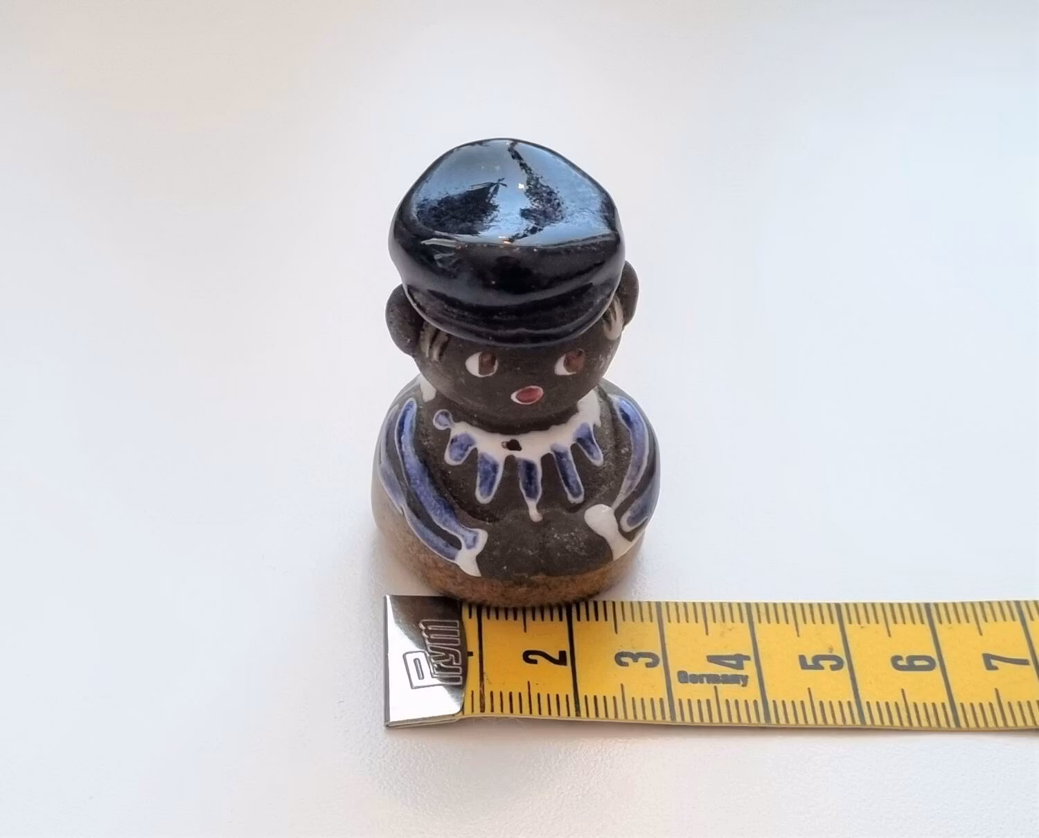 Söt handmålad figurin som föreställer en pojke med svart hatt som håller sig om magen. Oläslig signatur undertill. Fin figurin för dekorationDenna vara är begag