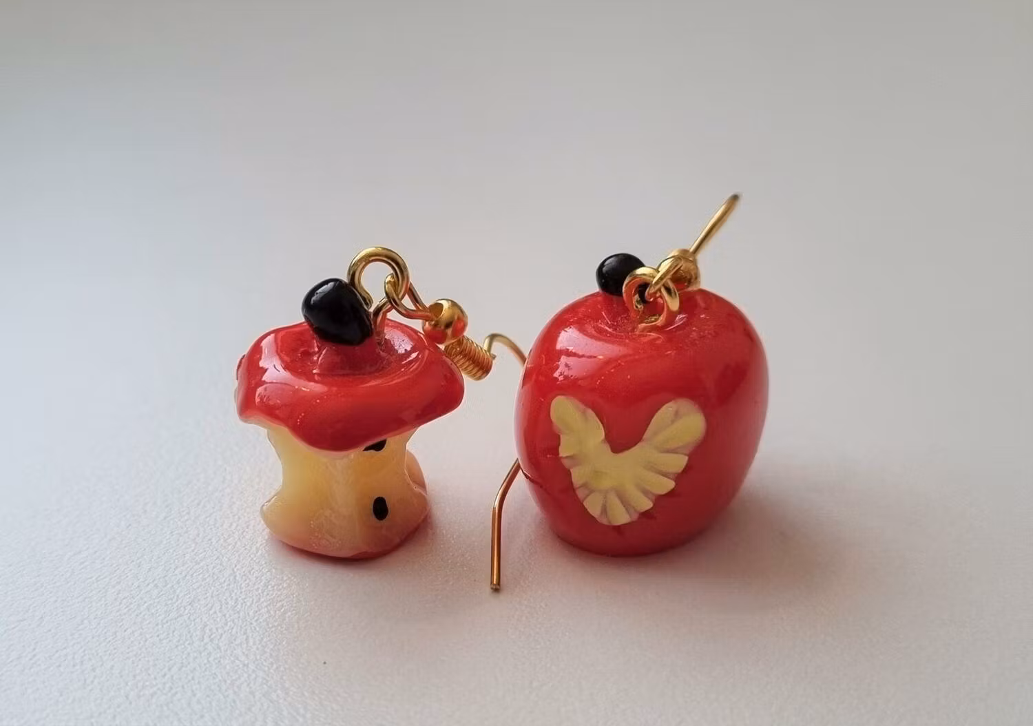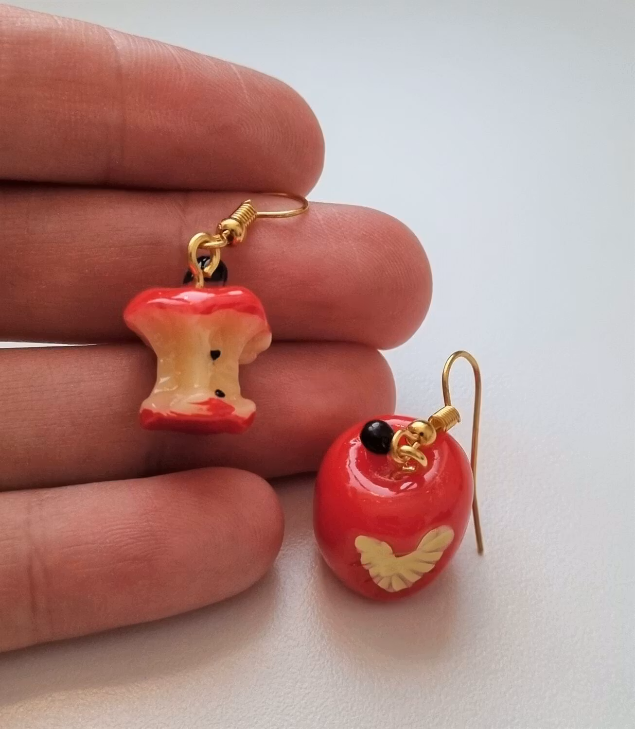 Söta örhängen i rostfritt stål med en charm / berlock som föreställer äpplen som fått sig ett par tuggor.