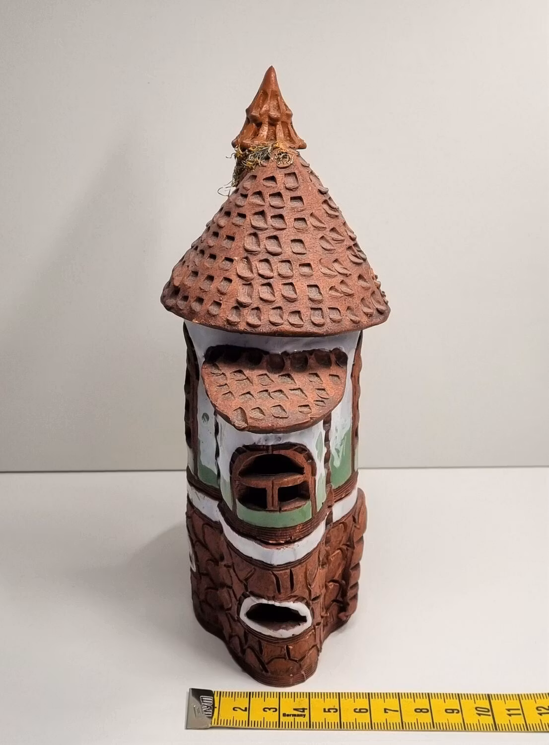 Öppningsbart miniatyrhus, minihus. Oklart om toppen på skorstenen hör till denna, då den skiljer sig aningen åt i nyansen. Tänk på att denna vara är begagnad vi